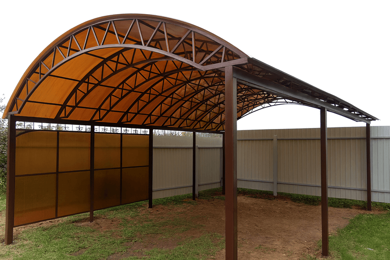 Клиент может заказать навес для автомобиля из поликарбоната в типовом исполнении или в виде индивидуального проекта. Все конструкции адаптируются под небольших или просторных участков, а также сочетаются с архитектурой дома. Возможность купить навес для автомобиля из поликарбоната недорого зависит от выбранной формы, толщины покрытия и длины пролета.